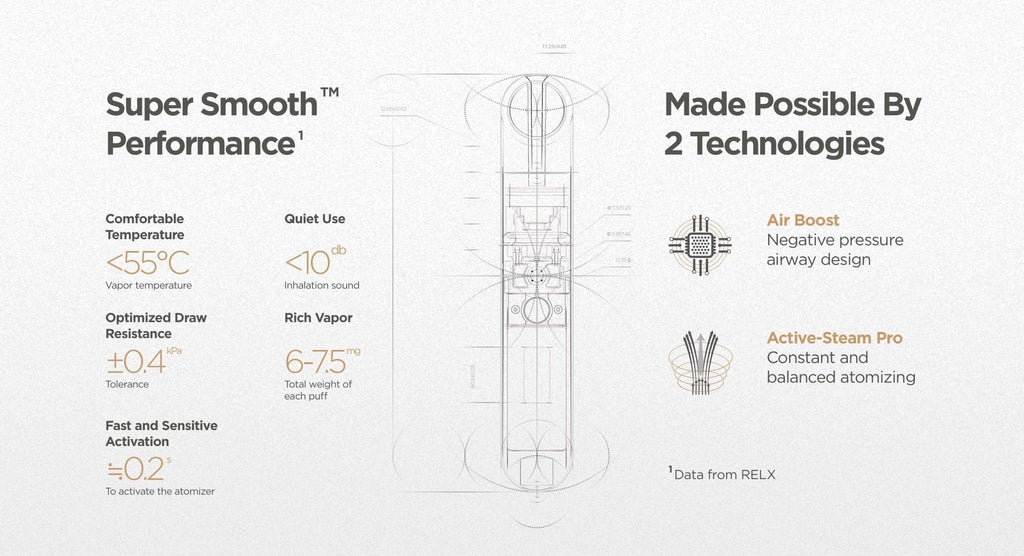 The kit comes with a 380mAh battery, type C fast charging and what RELX call SuperSmooth technology. This is said to provide a smooth, velvety vape that will be similar to smoking.