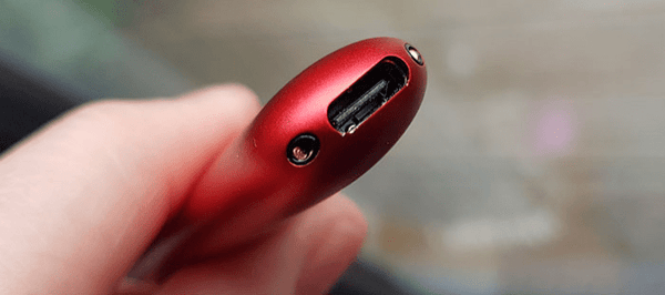 We have the RELX branding on one side, a couple of small airflow holes on either edge of the body and a small round light on one side. This light up as you vape and indicates your battery level.
